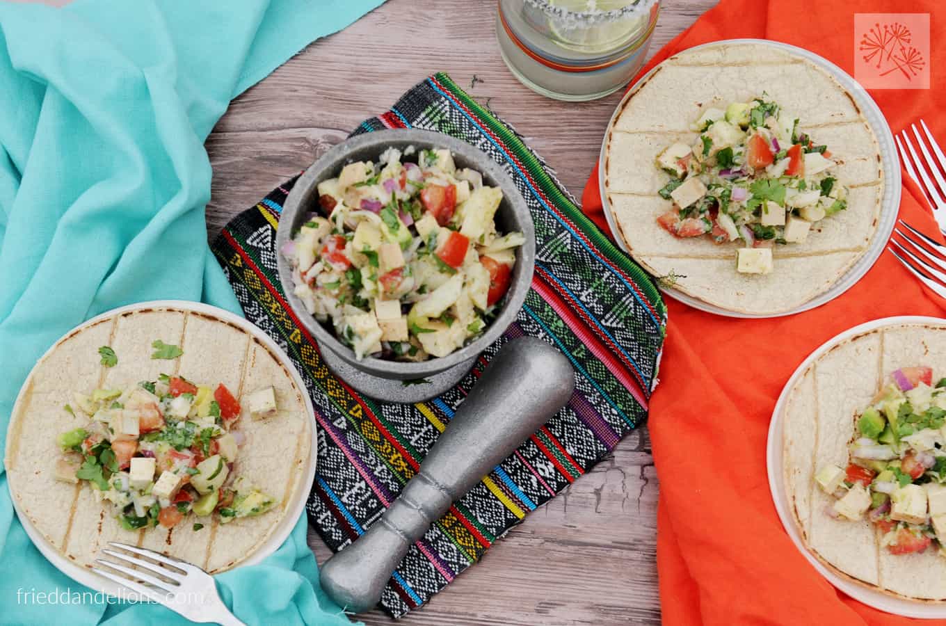 We’ll definitely be making this dish again—it would be an awesome summer meal! The ceviche would be a perfect taco filling, even though that is far from traditional. I served our Tostadas with Hearts of Palm Ceviche with my Frijoles de Cabo. It rounded it out for a perfect dinner. I can’t wait to explore the rest of the book. I’m dying to try the Helado de Elote (Corn Ice Cream)—it’s my favorite flavor when we go to Puerto Rico and I can’t wait to try it at home. And the Bebidas (drinks) section is calling my name….loudly! Want to see for yourself? Enter below to win a copy of Vegan Mexico by Jason Wyrick (US residents only please)! And be sure to try out the ceviche recipe below!