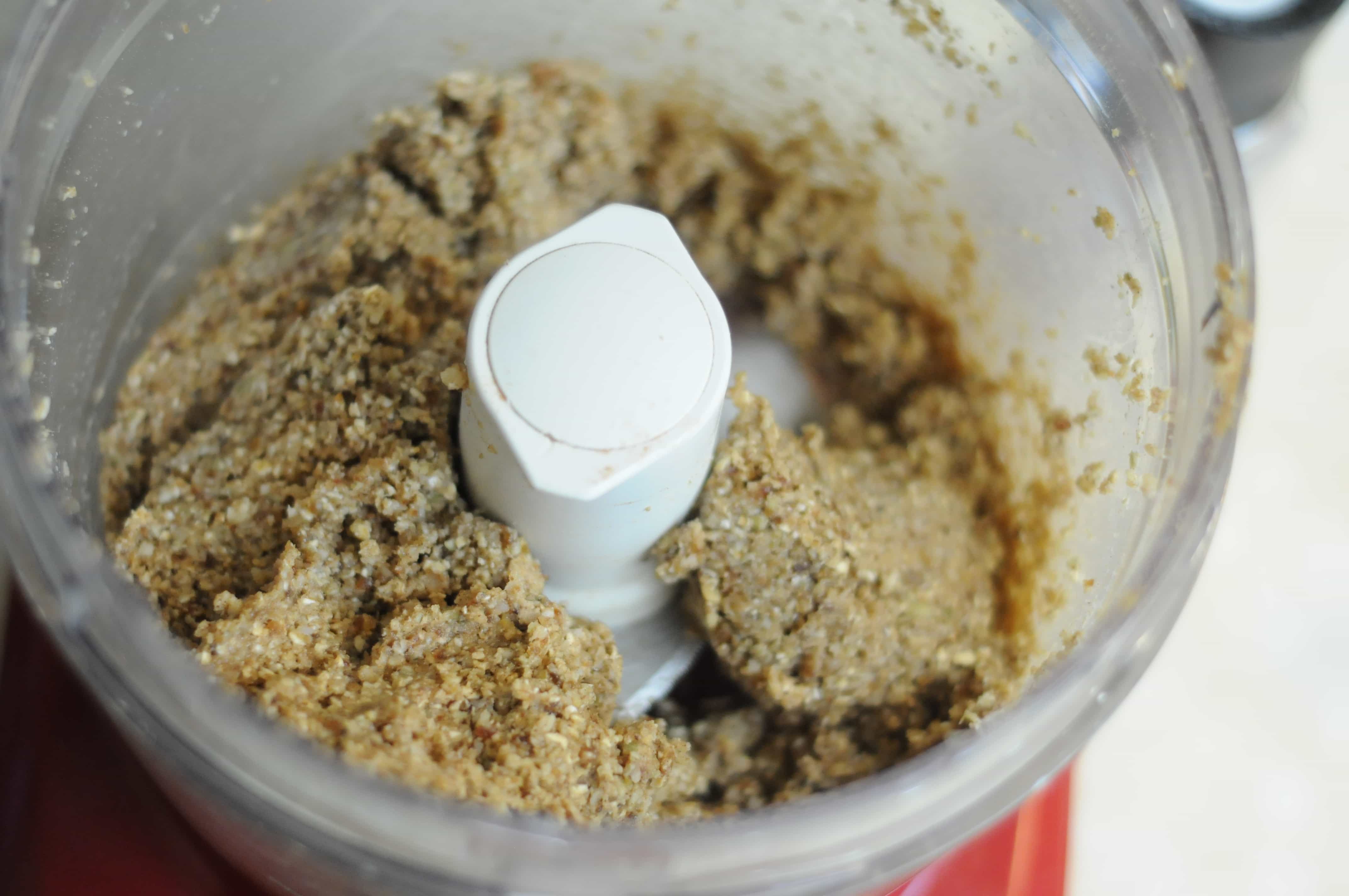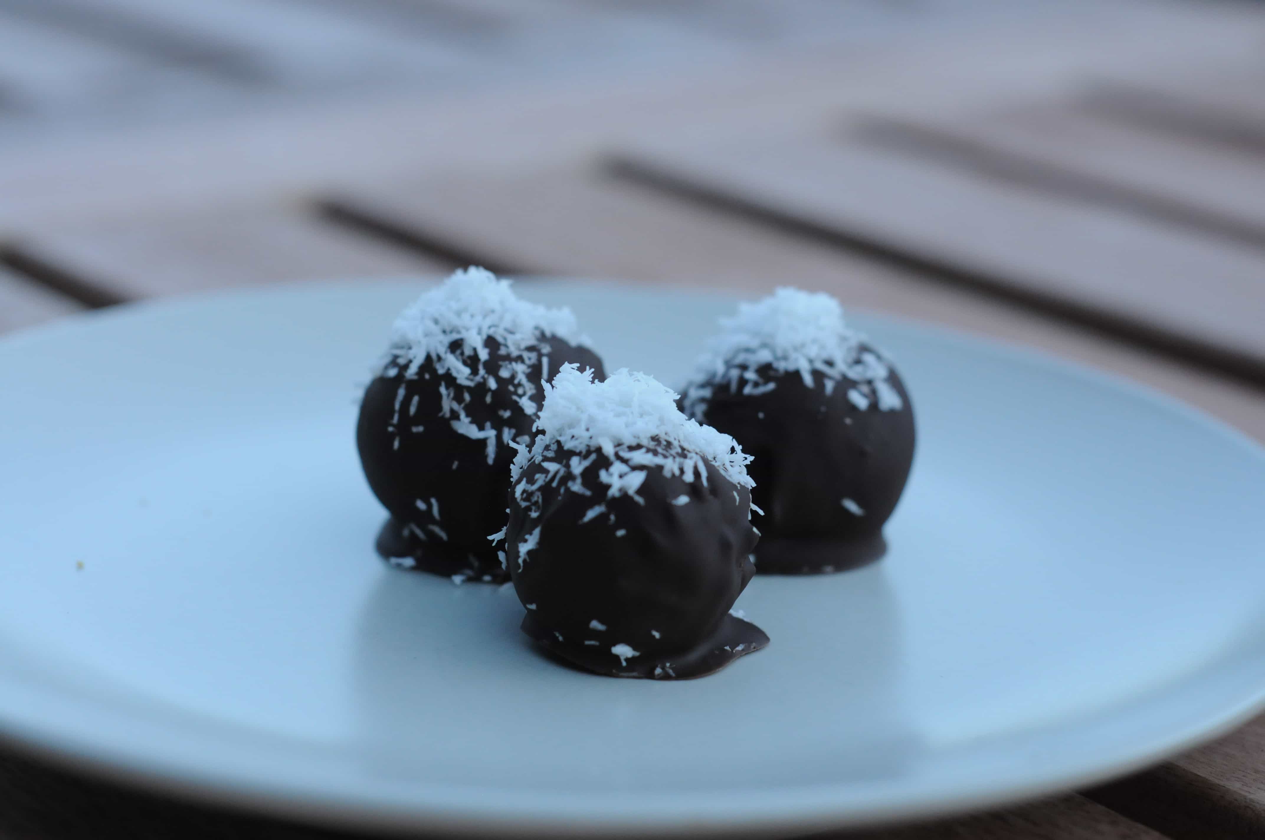 Place all ingredients except for the water, chocolate, and garnish coconut into your food processor. Turn on and let it run for a minute or two, stopping to scrape down the sides. Once the large pieces are broken down, slowly add water a tablespoon at a time and run between each addition. When it starts to come together and can be formed into a ball it is ready.