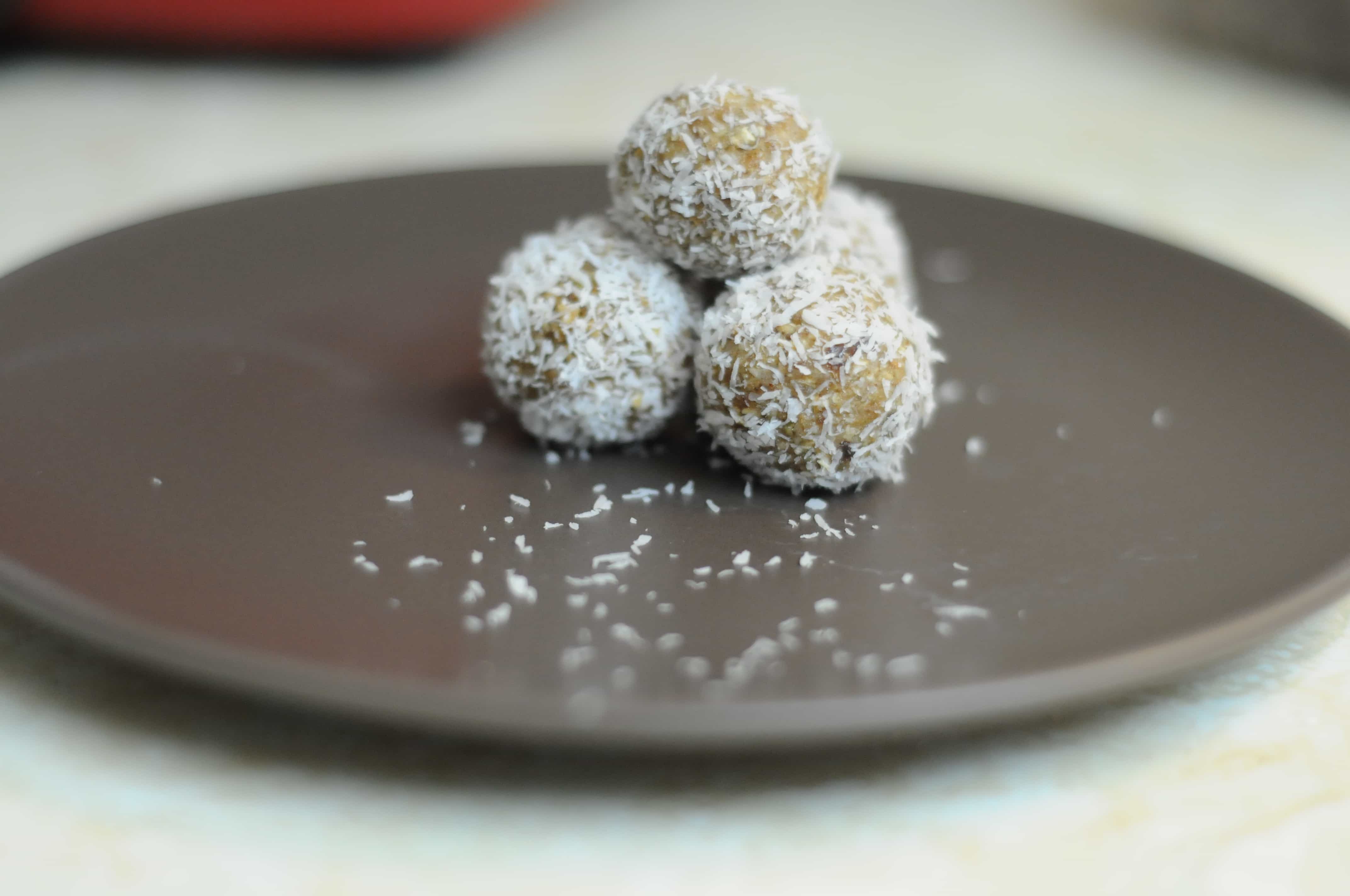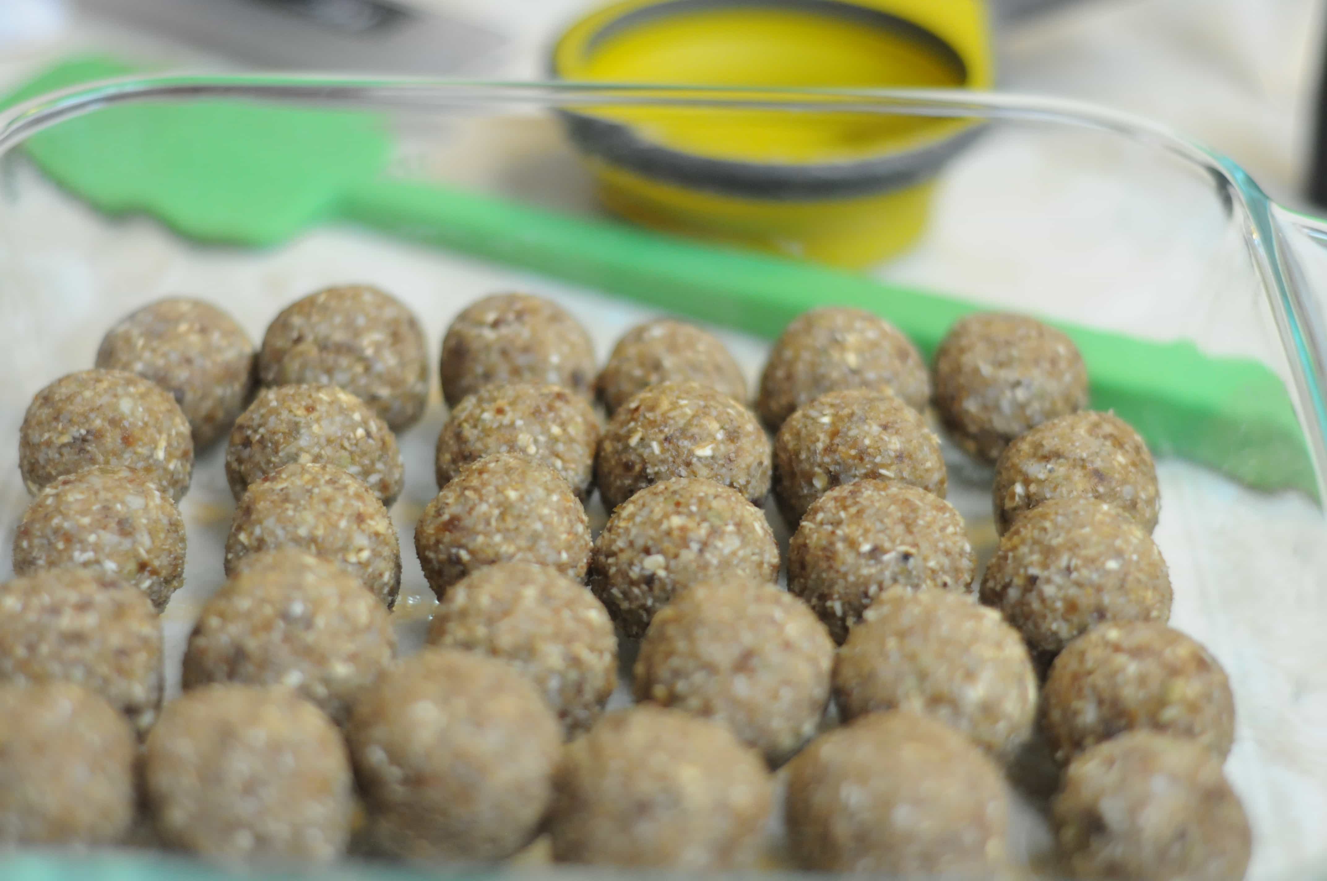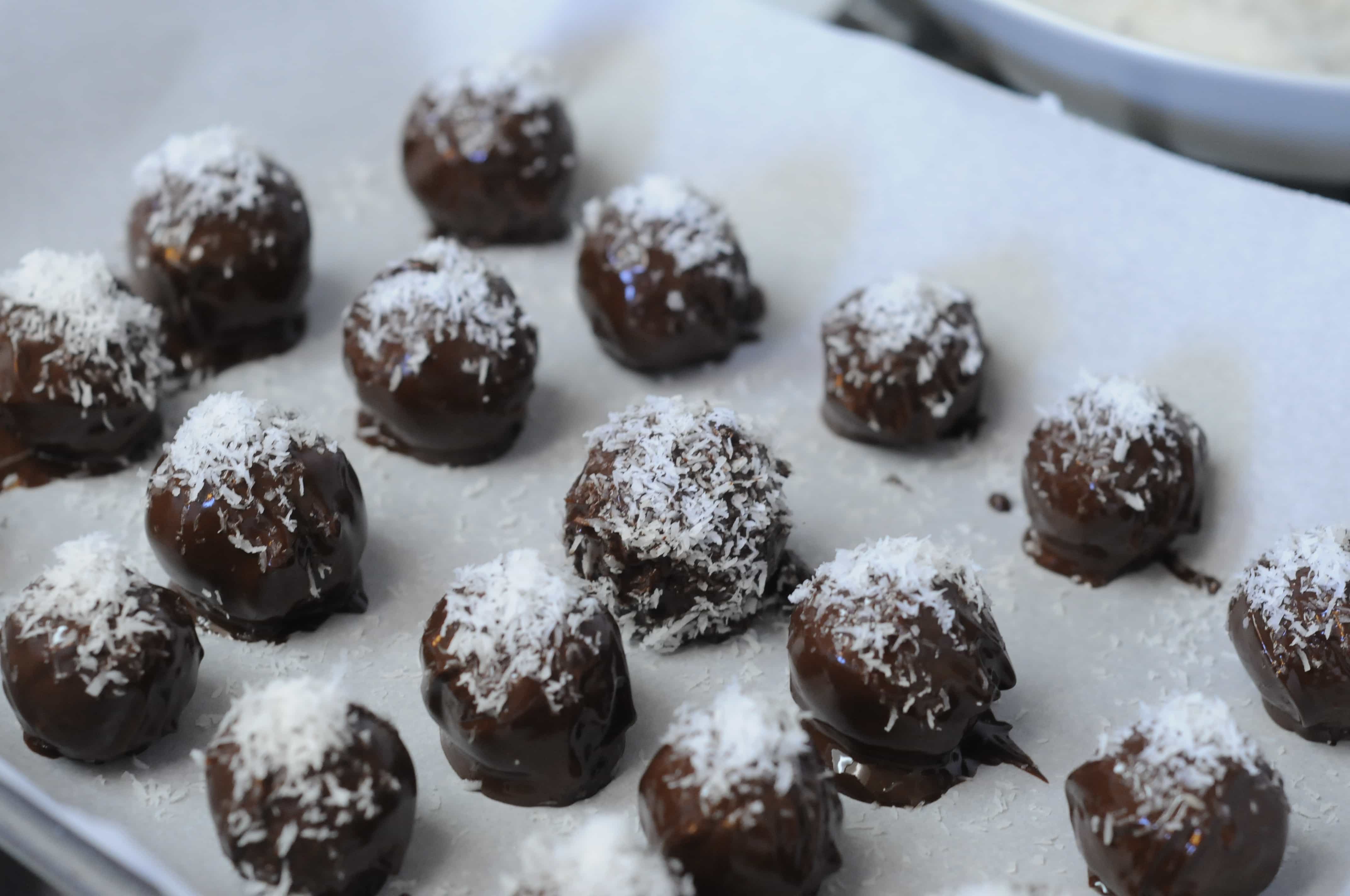 Scoop a rounded teaspoon and roll between palms of both hands. You can wet your hands with cold water to keep from sticking if you want. Once round, either roll in coconut, or set aside if dipping in chocolate. Once all balls are rolled, place in container with lid and chill in fridge for 1 hour, or overnight.