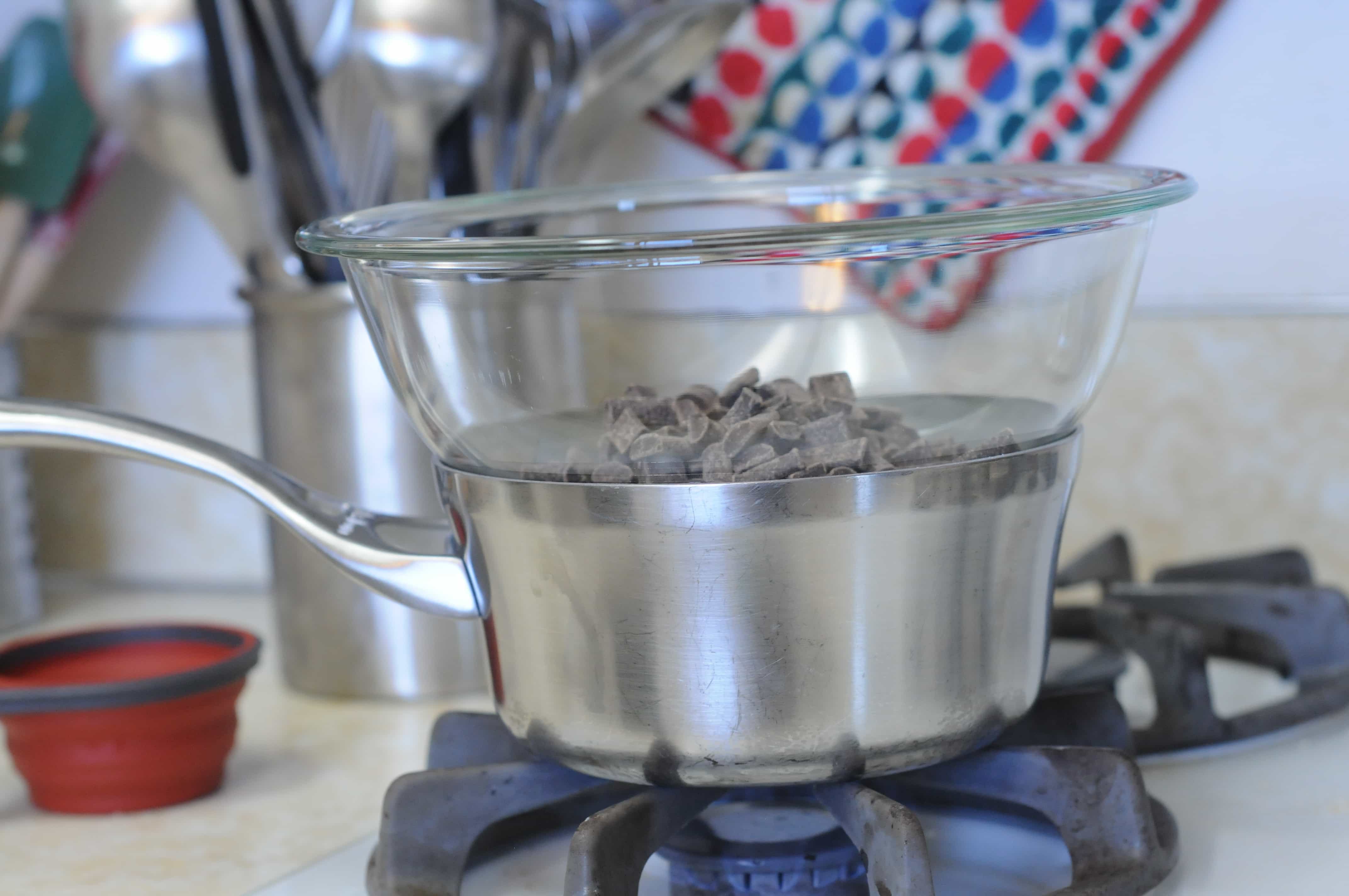 Set a glass bowl over a saucepan filled with an inch or two of water. Place on stove and warm water without bringing to a boil.