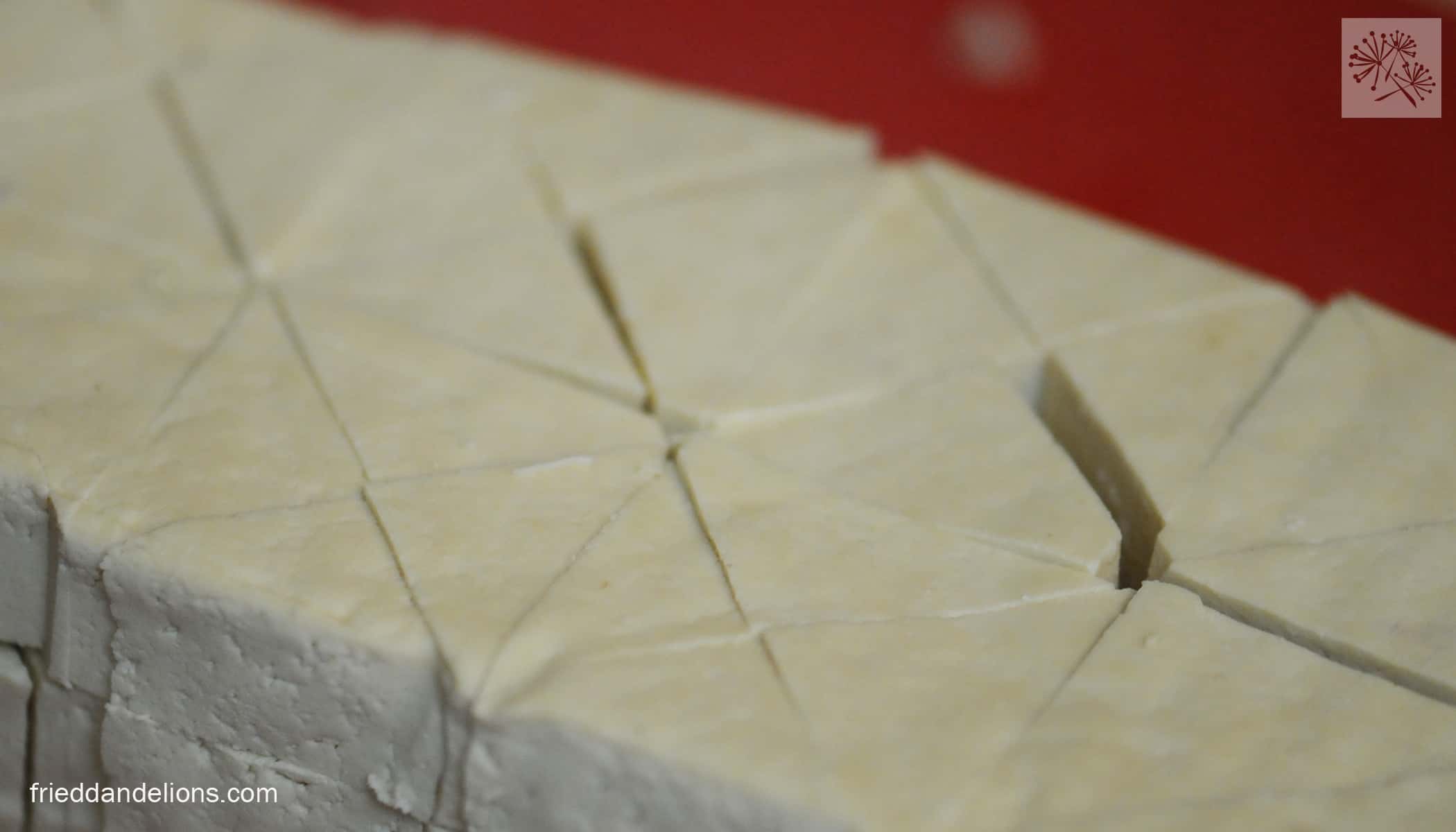 Remove tofu from package and wrap it in a paper towel or 2, put the wrapped tofu on a plate and place another plate on top of the tofu. Place something heavy on top (I use one of my storage canisters). Let rest at least 20 minutes to press excess moisture out. This will give the tofu a firmer consistency.