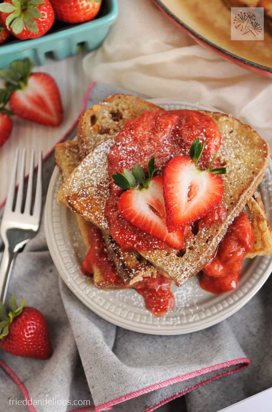 Simple 5 minute strawberry sauce simmers while the French toast cooks and within minutes you have a fancy meal, certainly worthy of holiday house guests. They’ll think you spent hours working in the kitchen—shhhhh….our little secret!