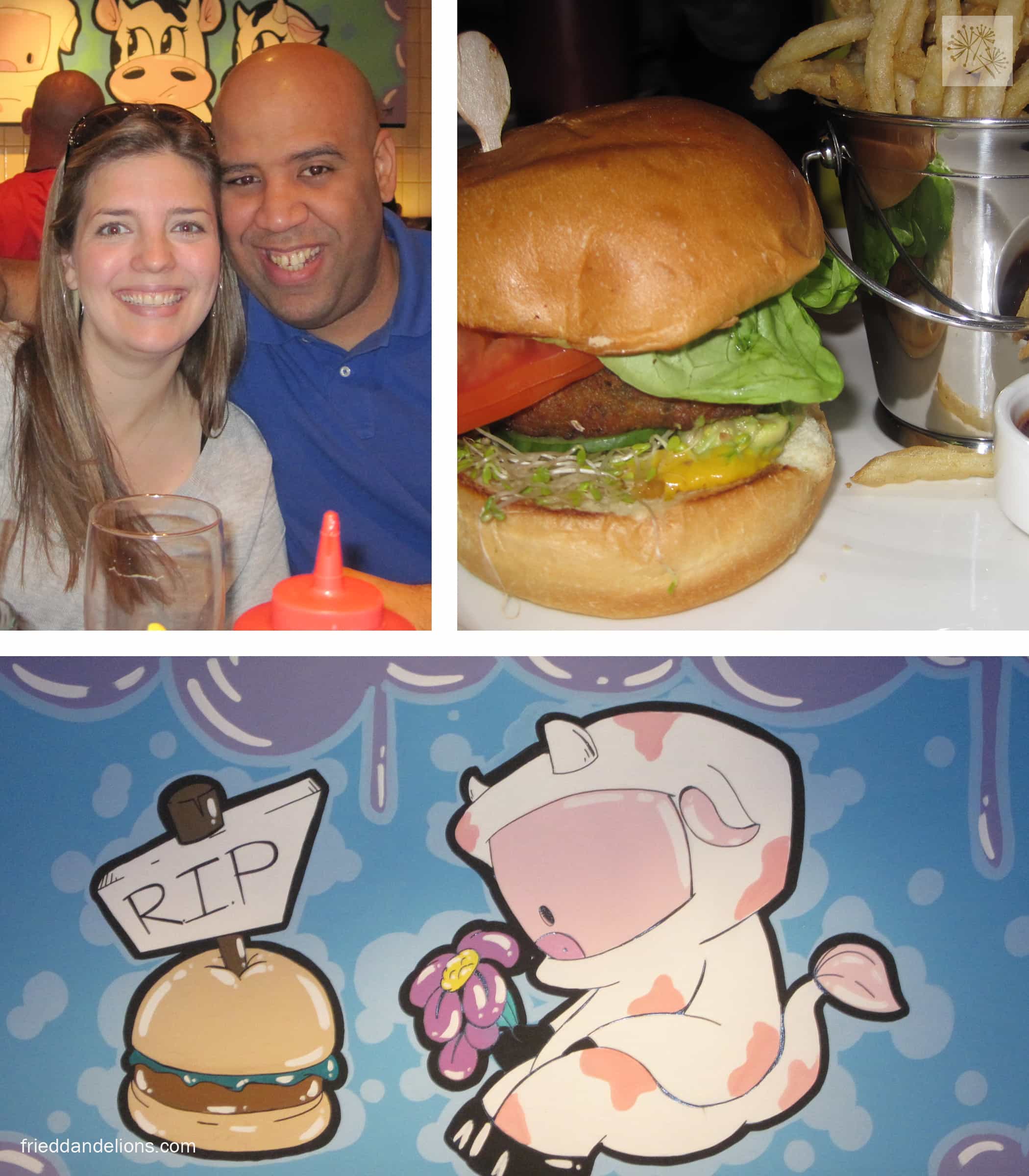 On Saturday we stopped by Holsteins, a burger joint in the new Cosmopolitan Hotel. I did a quick scan of the menu and as soon as I saw the word vegan we asked for a table! While the specialize in burgers and shakes, they had an Urth burger which looked to be based on garbanzos, and was completely vegan. With a side of fries and a cold beer I was a happy girl! And even better, my non-vegan dining companions were all able to get what they wanted too—I love when we can all get what we want! I did find the mural across from me to be funny—at least a good step in awareness!