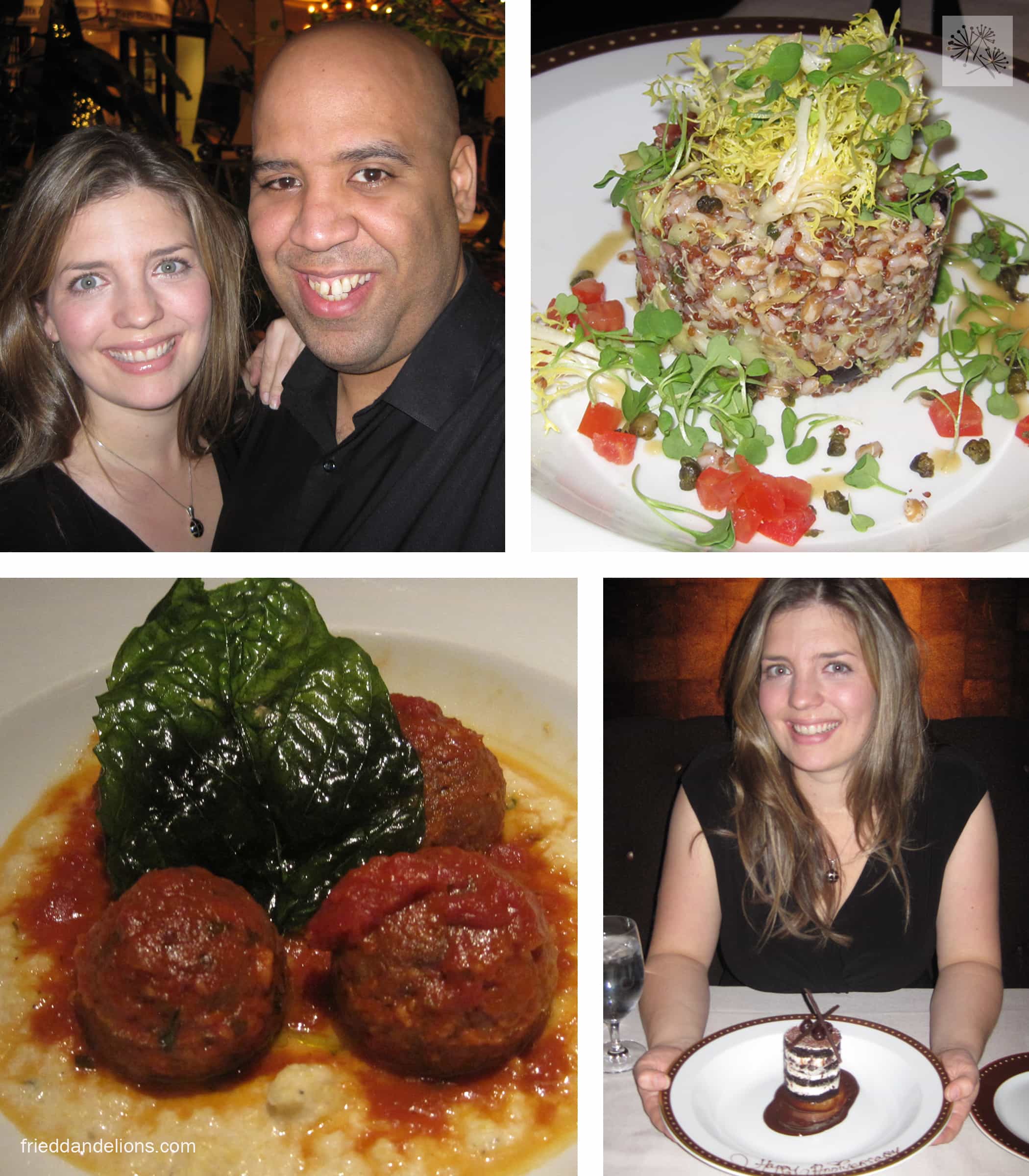 After spending the rest of the day walking…and walking…and walking we got all decked out for our anniversary dinner at the SW Steakhouse at the Wynn Casino. I was excited to see a whole page dedicated to 5 star vegan options! I started my meal with a quinoa farro salad with tomatoes, cucumbers, olives, sprouts, and a red wine vinaigrette. It was so delicious, and I loved the way it was presented. For my entree, I finally decided on the vegan meatballs on a bed of creamy polenta which tasted so much like their meat counterparts. They were really yummy. (That garnish is a fried basil leaf—it was almost translucent—beautiful!) And for dessert I had a black forrest chocolate cake, with “Happy Anniversary” written in chocolate on the plate! I thought that was fun because at our wedding reception our cake plates had “Congratulations” written in chocolate on them!