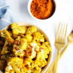Once the cauliflower is fork tender with golden crispy edges remove from the air fryer and serve!