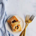 Then use a fork (or other tool) to crimp the edges, pushing down and making sure the two layers of dough really meet. Set on a pan lined with parchment paper and continue this process until all pies are assembled, including the second sheet of puff pastry.