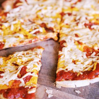 Carefully transfer pizza onto a cutting board to cool—I use a large spatula for this. The pizza will be crisp so it should transfer easily. Allow to cool for a minute before cutting to help keep the cheese from sliding off.