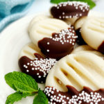 Quickly dip halfway into the melted chocolate. Place on a piece of parchment and sprinkle with sprinkles. Place in freezer to firm up. Mint filling will dry and become less tacky as it chills.
