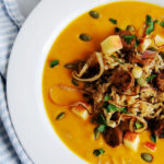 While the soup is cooking you can prep your toppings. In a frying pan, heat a drizzle of oil and add the shallots. Cook over medium heat until they are browned and slightly crispy—about 15 minutes. Remove to a plate lined with a paper towel to drain oil. Place the veggie sausages in the pan and cook to heat them through and crisp them up a bit. Remove from heat. Prepare other toppings and set aside.
