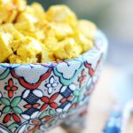 Heat the oil in a large pan over medium high heat (I use my beloved cast iron). Add the seasoned tofu to the pan and stir and distribute. Let it cook for about 2 minutes and give it another stir. As the tofu starts to heat through add the bouillon paste and water. Stir it well and cook until heated through, the stock has completely incorporated, the tofu is yellow, and delicious! Serve right away with your favorite breakfast menu!