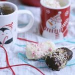 Remove the tray from the freezer. Repeat the dipping process, using the spoon to coat each marshmallow. This time, sprinkle with sprinkles or candy canes before setting back down on the tray—I like to hold the stick over the bowl or sprinkles and turn it in one hand while sprinkling with the other.