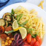 Assemble your bowls: I start with a scoop of pasta, add the sautéed and fresh vegetables, and top with a ladle of the broth. Garnish with basil and a lemon wedge. Serve and enjoy!