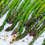 Place in oven and roast for 8-12 minutes, keeping a close eye on the asparagus. Tips will brown just a tiny bit and the stalks will stay bright green, and be easily pierced with a fork.