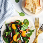 The classic spinach salad with bacon goes vegan! This easy smokey vinaigrette, crispy vegan bacon, and juicy mandarin orange slices pack tons of flavor, making this salad anything but ordinary!