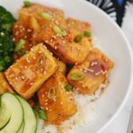 Once the tofu has baked remove it from the oven and transfer to a hot cast iron skillet (you can add a drizzle of vegetable oil into the pan). Pour about 1/4 to 1/2 c of the sauce on to the tofu. Toss to coat completely, about 2 minutes. Serve with rice, pickled cucumbers (below), steamed broccoli, etc. Enjoy!