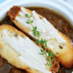 For the bread: While soup simmers, arrange baguette slices in single layer on a parchment lined baking sheet and toast under the broiler until golden brown. Remove from oven and rub each slice with an open side of a clove of garlic.  Set aside.