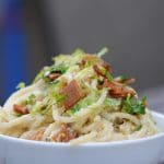 Once the pasta is cooked, drain and set aside. Pour the sauce mix into the empty pasta pot and heat over medium low heat. You want to cook the garbanzo flour for a minute to get rid of the raw taste! Add the pasta back into the pot and stir to coat. Add the butter on top and continue to mix til the sauce is a little smoother and creamy. Toss in the bacon Brussels sprout mix and mix well. Serve and amaze your guests!
