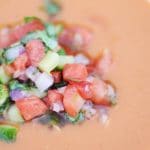 Place all of the gazpacho ingredients in a blender (watermelon through red onion). Blend well until all chunks are gone and it is smooth. Place in a large container with a lid and refrigerate for 3 hours to allow flavors to mingle.